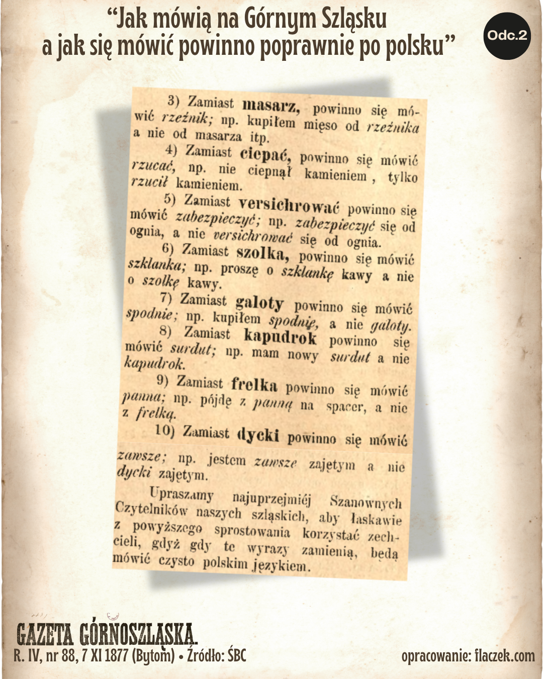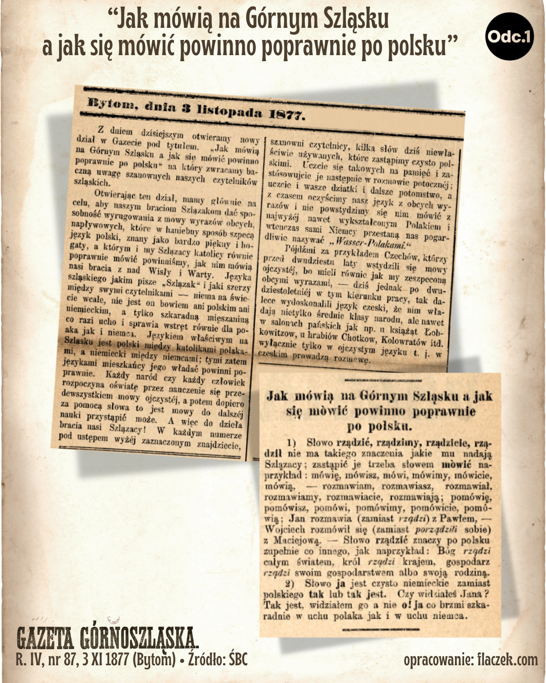 „…gwara środkowo-górnośląska, będąca w użyciu w obwodzie przemysłowym — prześpiewna, czarująca, ze skargowskimi zwrotami i wyrazami rdzennie staropolskimi, które domagają się prawa obywatelstwa w dzisiejszej mowie polskiej.” — Ludwik Łakomy, „Kwiaty na hałdach”W cyklu nie „prostujemy” gwary — bierzemy #ŚlōnskoGodka tak, jak brzmiała.